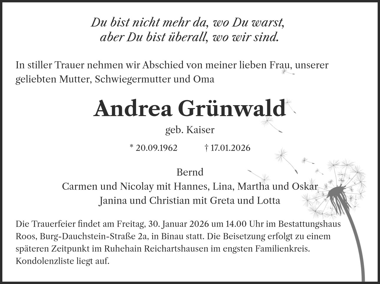 Die Trauerfeier findet am Freitag, 30. Januar 2026 um 14.00 Uhr im Bestattungshaus Roos, Burg-Dauchstein-Straße 2a, in Binau statt. Die Beisetzung erfolgt zu einem späteren Zeitpunkt im Ruhehain Reichartshausen im engsten Familienkreis. Kondolenzliste liegt auf.