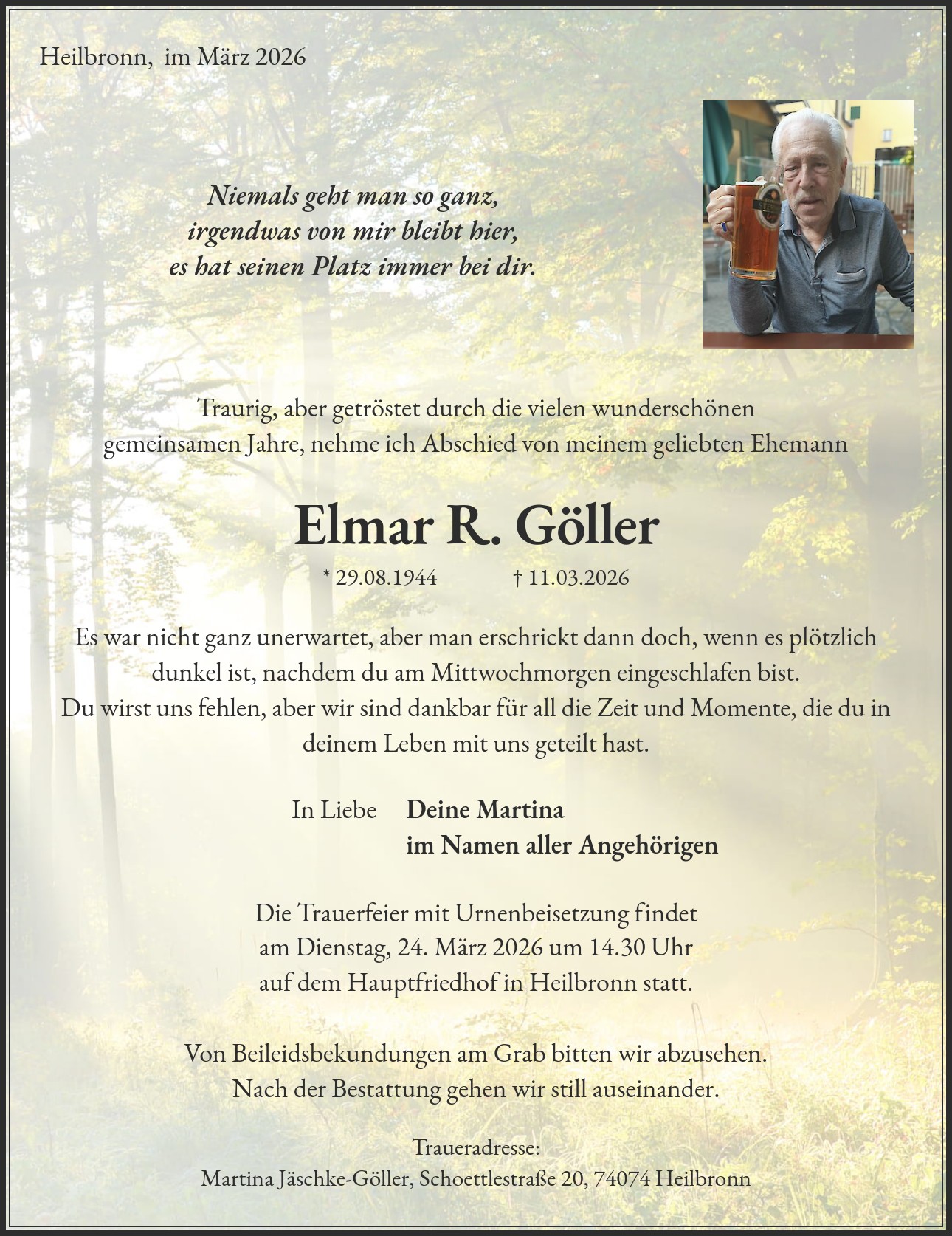 Die Trauerfeier mit Urnenbeisetzung findet am Dienstag, 24. März 2026 um 14.30 Uhr auf dem Hauptfriedhof in Heilbronn statt. Von Beileidsbekundungen am Grab bitten wir abzusehen. Nach der Bestattung gehen wir still auseinander.
