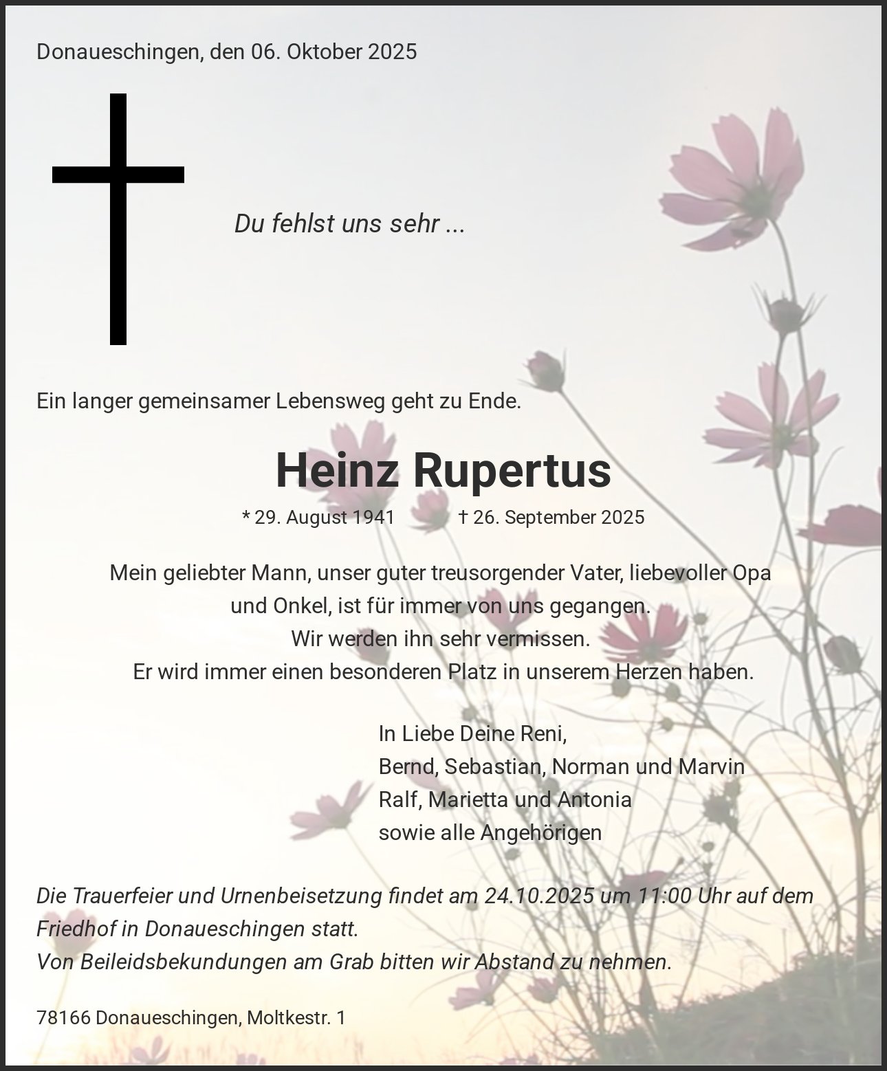 Die Trauerfeier und Urnenbeisetzung findet am 24.10.2025 um 11:00 Uhr auf dem Friedhof in Donaueschingen statt. Von Beileidsbekundungen am Grab bitten wir Abstand zu nehmen.