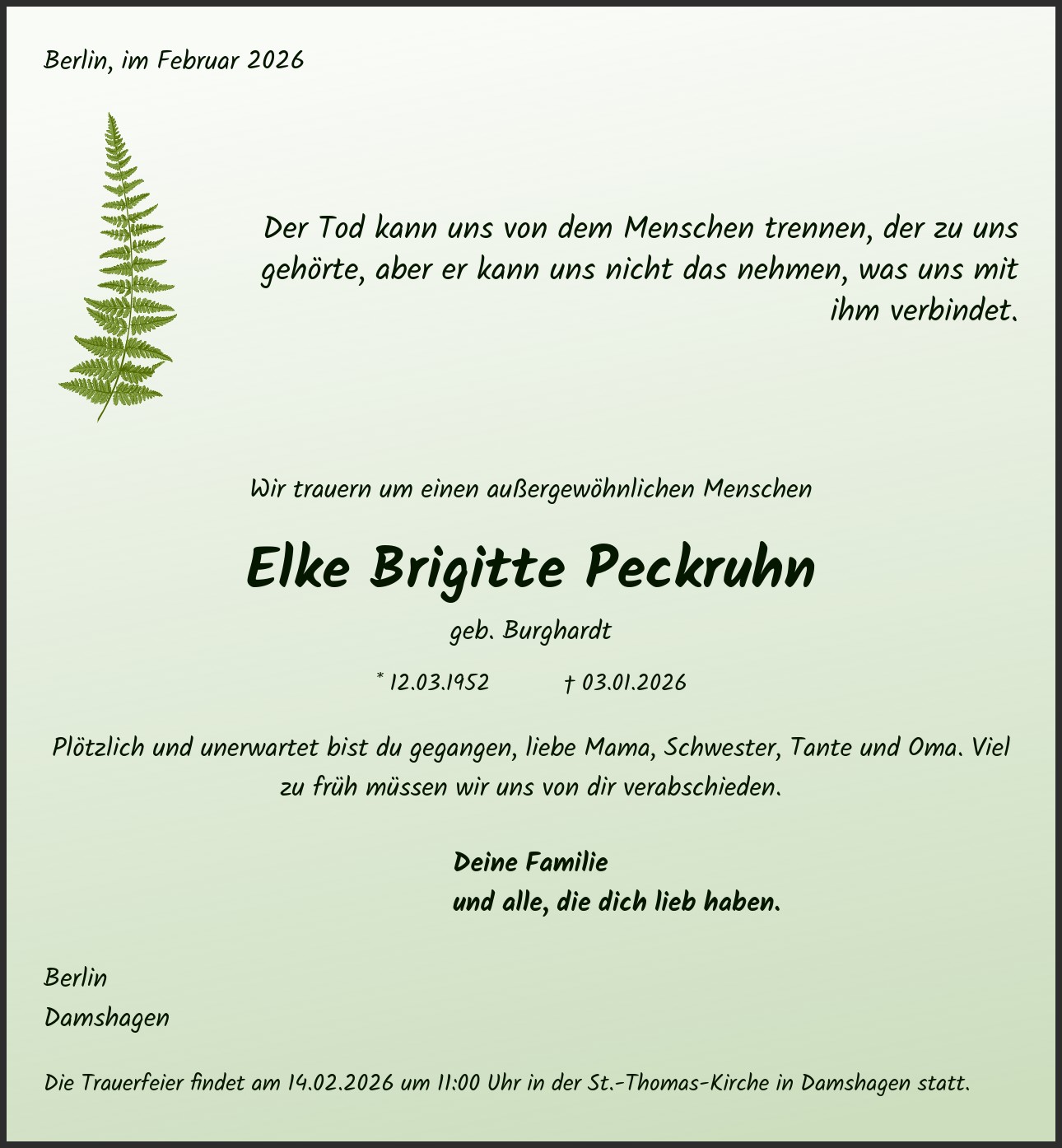 Die Trauerfeier findet am 14.02.2026 um 11:00 Uhr in der St.-Thomas-Kirche in Damshagen statt.