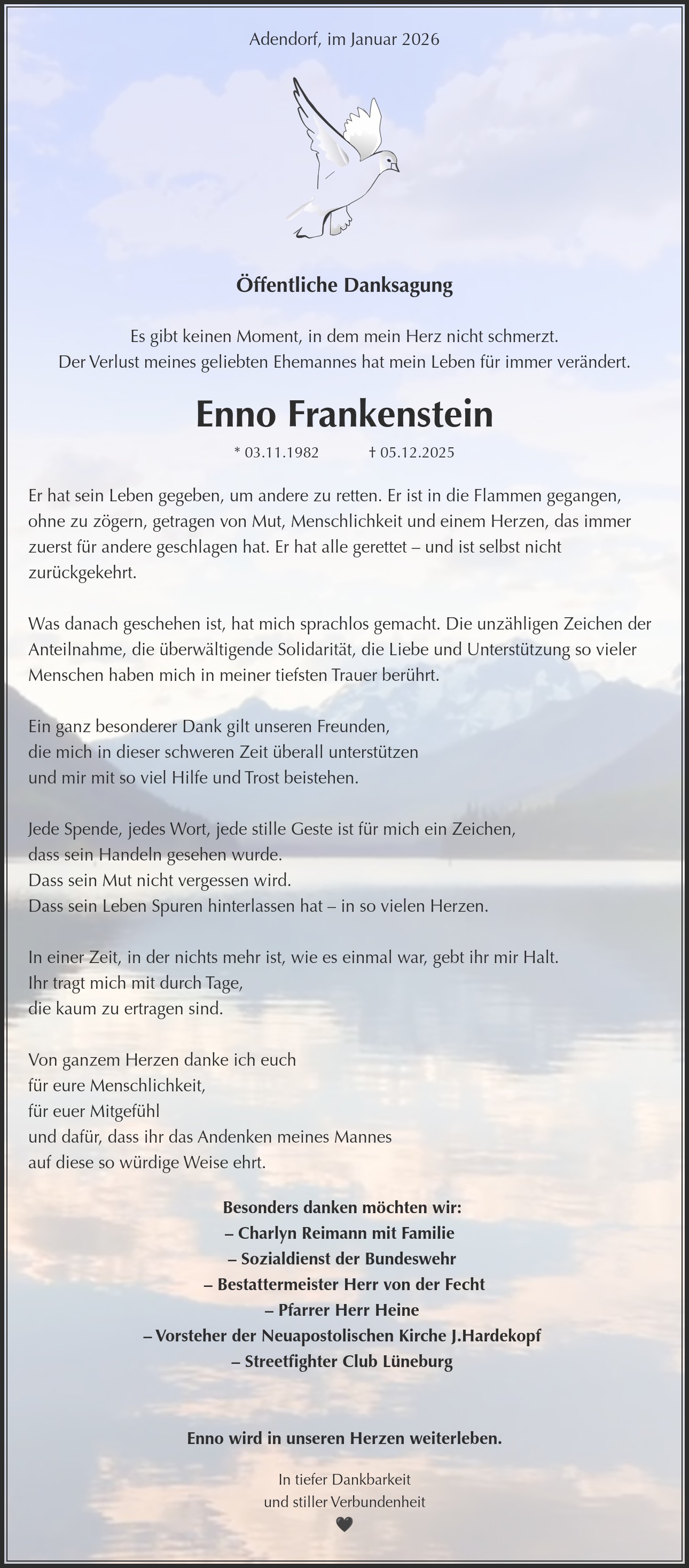 Er hat sein Leben gegeben, um andere zu retten. Er ist in die Flammen gegangen, ohne zu zögern, getragen von Mut, Menschlichkeit und einem Herzen, das immer zuerst für andere geschlagen hat. Er hat alle gerettet – und ist selbst nicht zurückgekehrt. Was danach geschehen ist, hat mich sprachlos gemacht. Die unzähligen Zeichen der Anteilnahme, die überwältigende Solidarität, die Liebe und Unterstützung so vieler Menschen haben mich in meiner tiefsten Trauer berührt. Ein ganz besonderer Dank gilt unseren Freunden, die mich in dieser schweren Zeit überall unterstützen und mir mit so viel Hilfe und Trost beistehen. Jede Spende, jedes Wort, jede stille Geste ist für mich ein Zeichen, dass sein Handeln gesehen wurde. Dass sein Mut nicht vergessen wird. Dass sein Leben Spuren hinterlassen hat – in so vielen Herzen. In einer Zeit, in der nichts mehr ist, wie es einmal war, gebt ihr mir Halt. Ihr tragt mich mit durch Tage, die kaum zu ertragen sind. Von ganzem Herzen danke ich euch für eure Menschlichkeit, für euer Mitgefühl und dafür, dass ihr das Andenken meines Mannes auf diese so würdige Weise ehrt.