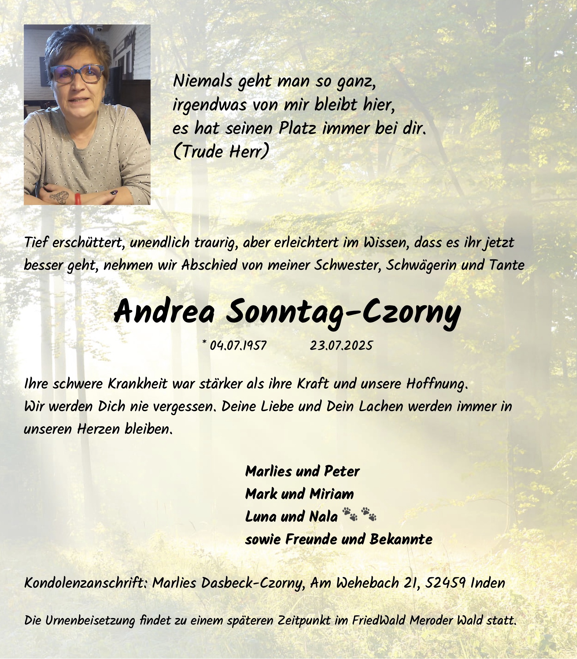 Kondolenzanschrift: Marlies Dasbeck-Czorny, Am Wehebach 21, 52459 Inden