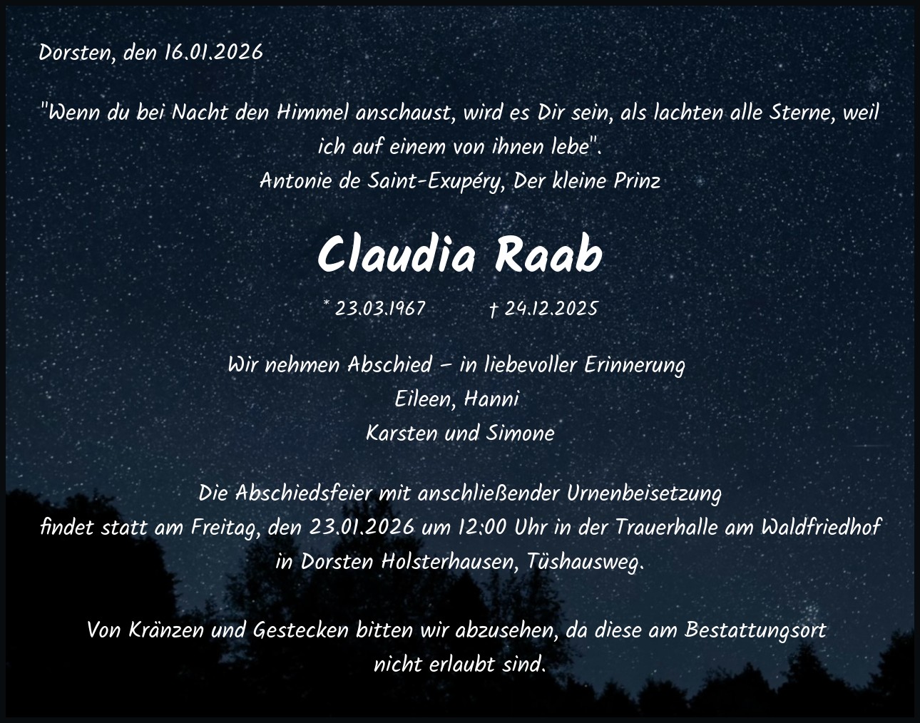 Die Abschiedsfeier mit anschließender Urnenbeisetzung findet statt am Freitag, den 23.01.2026 um 12:00 Uhr in der Trauerhalle am Waldfriedhof in Dorsten Holsterhausen, Tüshausweg. Von Kränzen und Gestecken bitten wir abzusehen, da diese am Bestattungsort nicht erlaubt sind.