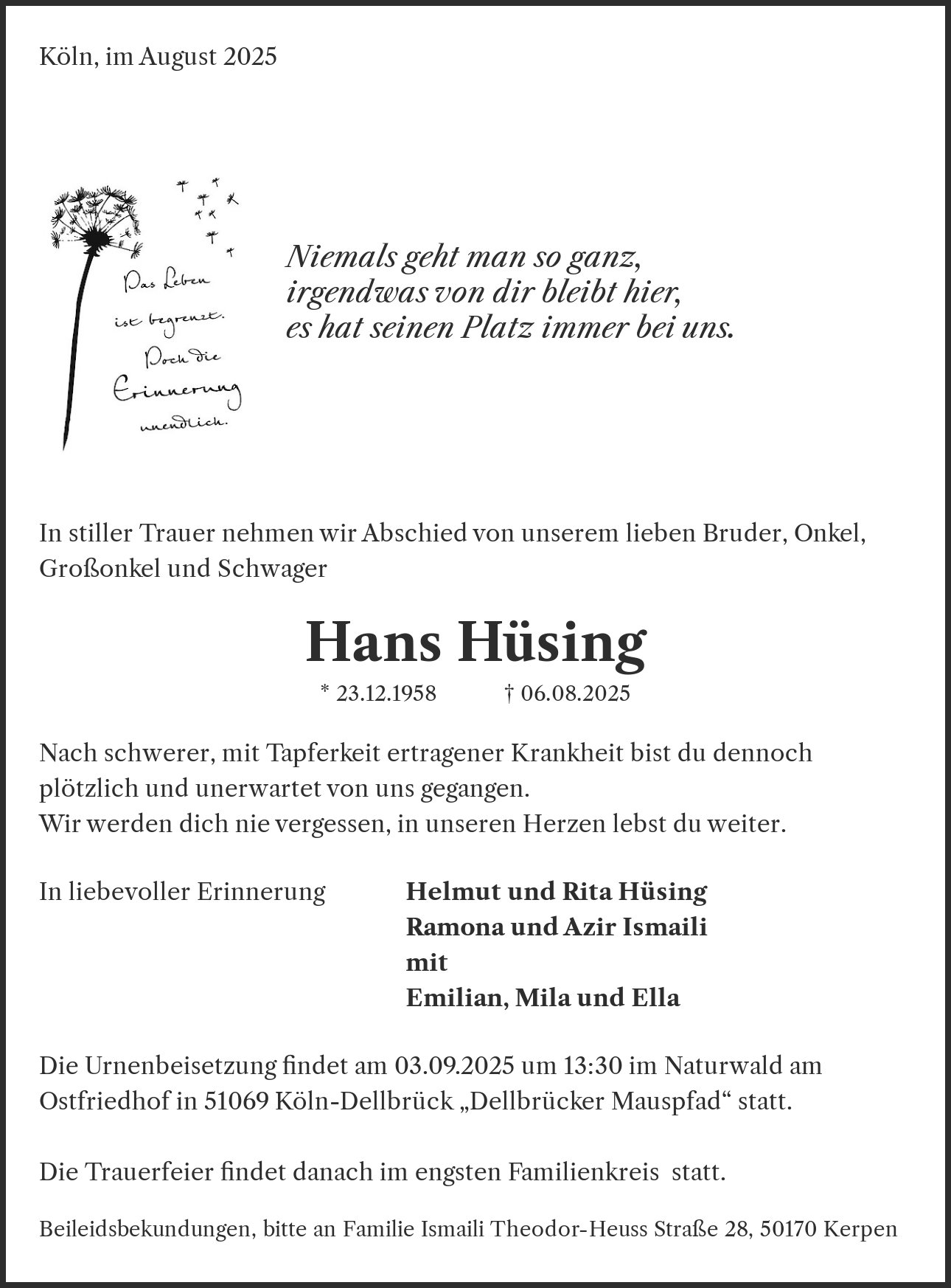 Die Urnenbeisetzung findet am 03.09.2025 um 13:30 im Naturwald am Ostfriedhof in 51069 Köln-Dellbrück „Dellbrücker Mauspfad“ statt. Die Trauerfeier findet danach im engsten Familienkreis statt.