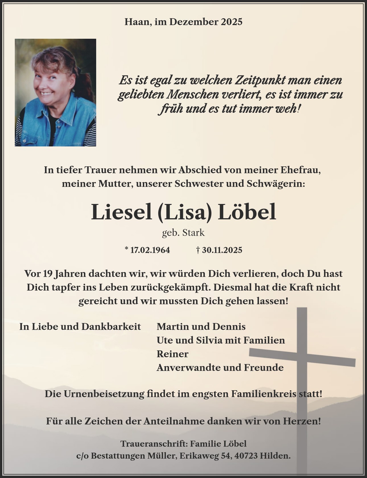Traueranschrift: Familie Löbel c/o Bestattungen Müller, Erikaweg 54, 40723 Hilden.