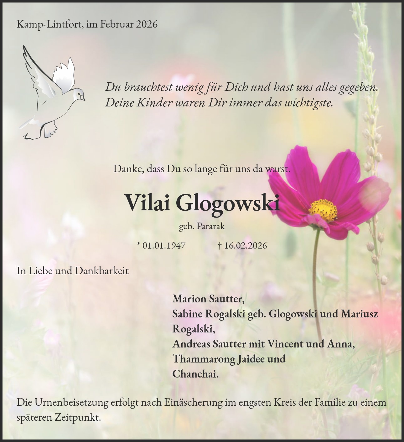 Die Urnenbeisetzung erfolgt nach Einäscherung im engsten Kreis der Familie zu einem späteren Zeitpunkt.