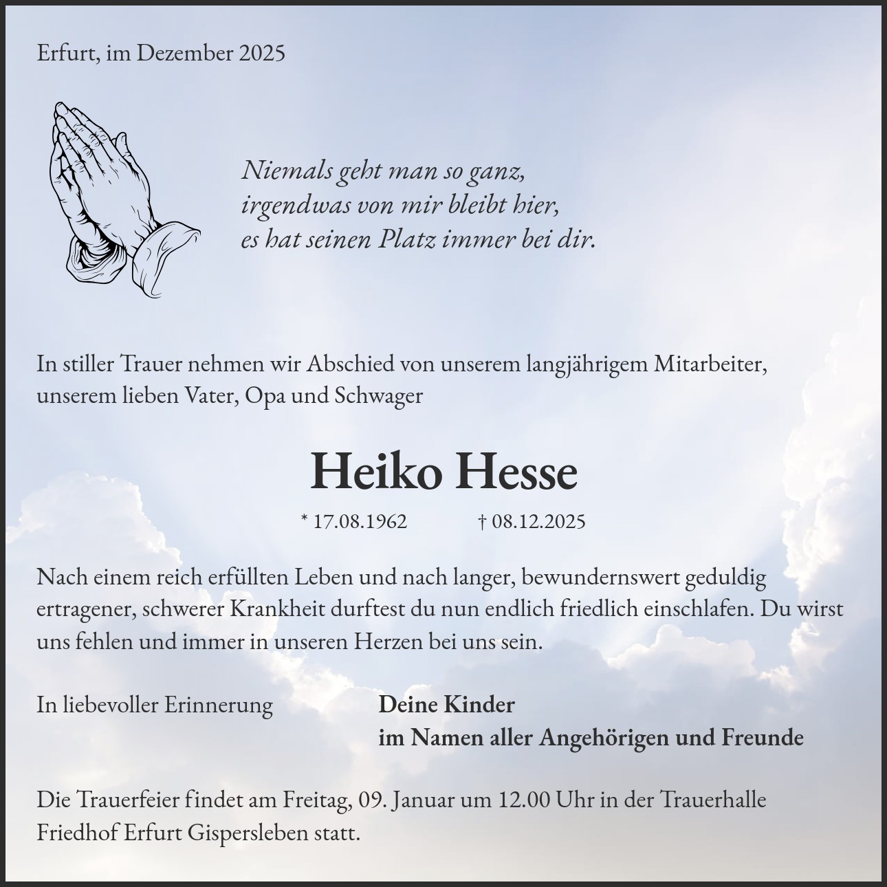 Die Trauerfeier findet am Freitag, 09. Januar um 12.00 Uhr in der Trauerhalle Friedhof Erfurt Gispersleben statt.