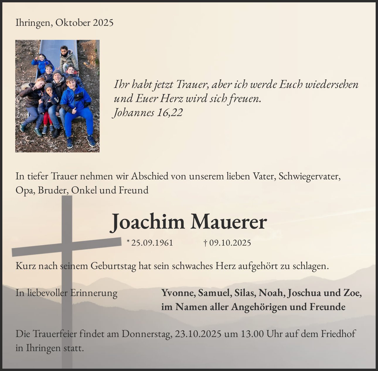 Die Trauerfeier findet am Donnerstag, 23.10.2025 um 13.00 Uhr auf dem Friedhof in Ihringen statt.