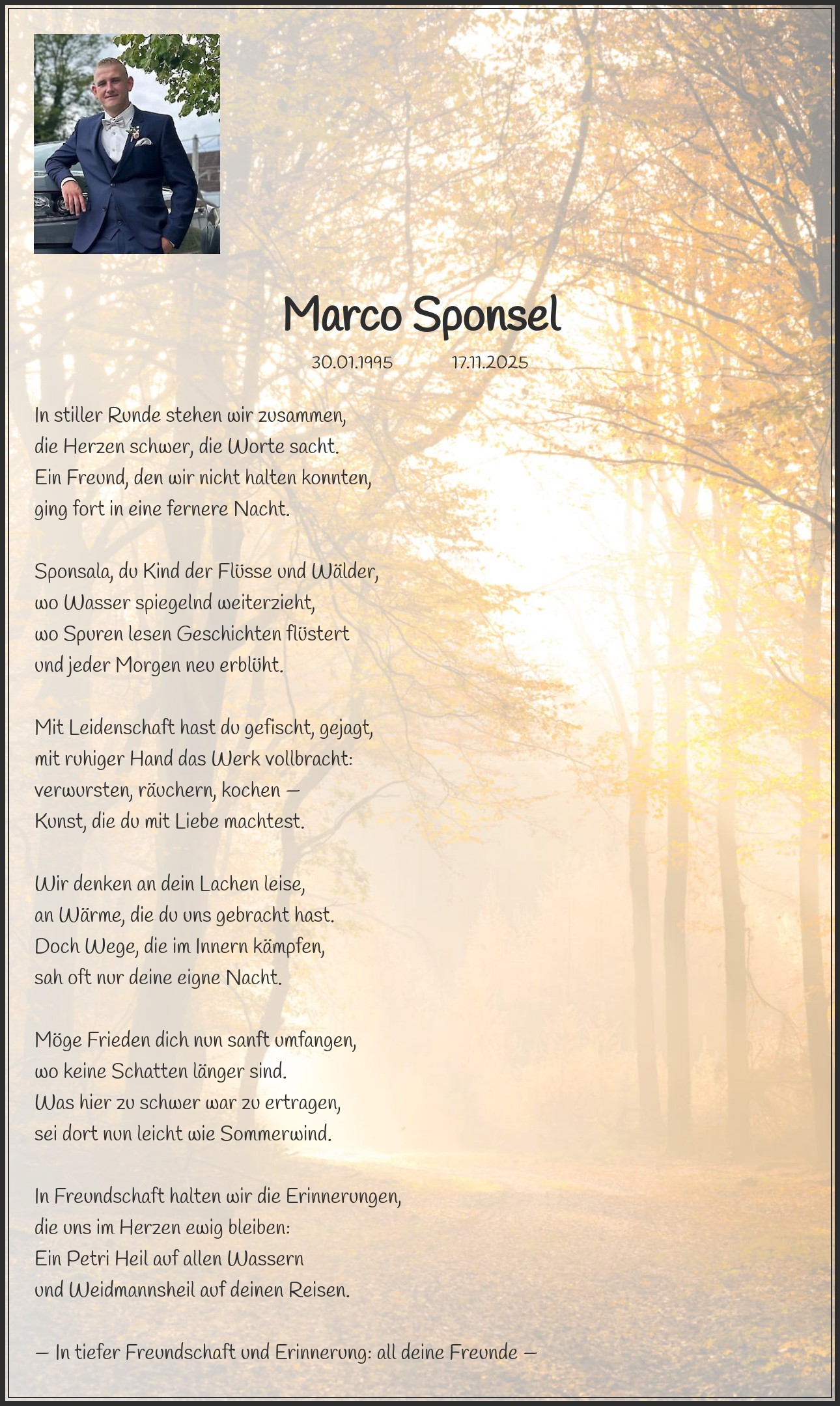 In stiller Runde stehen wir zusammen, die Herzen schwer, die Worte sacht. Ein Freund, den wir nicht halten konnten, ging fort in eine fernere Nacht. Sponsala, du Kind der Flüsse und Wälder, wo Wasser spiegelnd weiterzieht, wo Spuren lesen Geschichten flüstert und jeder Morgen neu erblüht. Mit Leidenschaft hast du gefischt, gejagt, mit ruhiger Hand das Werk vollbracht: verwursten, räuchern, kochen — Kunst, die du mit Liebe machtest. Wir denken an dein Lachen leise, an Wärme, die du uns gebracht hast. Doch Wege, die im Innern kämpfen, sah oft nur deine eigne Nacht. Möge Frieden dich nun sanft umfangen, wo keine Schatten länger sind. Was hier zu schwer war zu ertragen, sei dort nun leicht wie Sommerwind. In Freundschaft halten wir die Erinnerungen, die uns im Herzen ewig bleiben: Ein Petri Heil auf allen Wassern und Weidmannsheil auf deinen Reisen. — In tiefer Freundschaft und Erinnerung: all deine Freunde —
