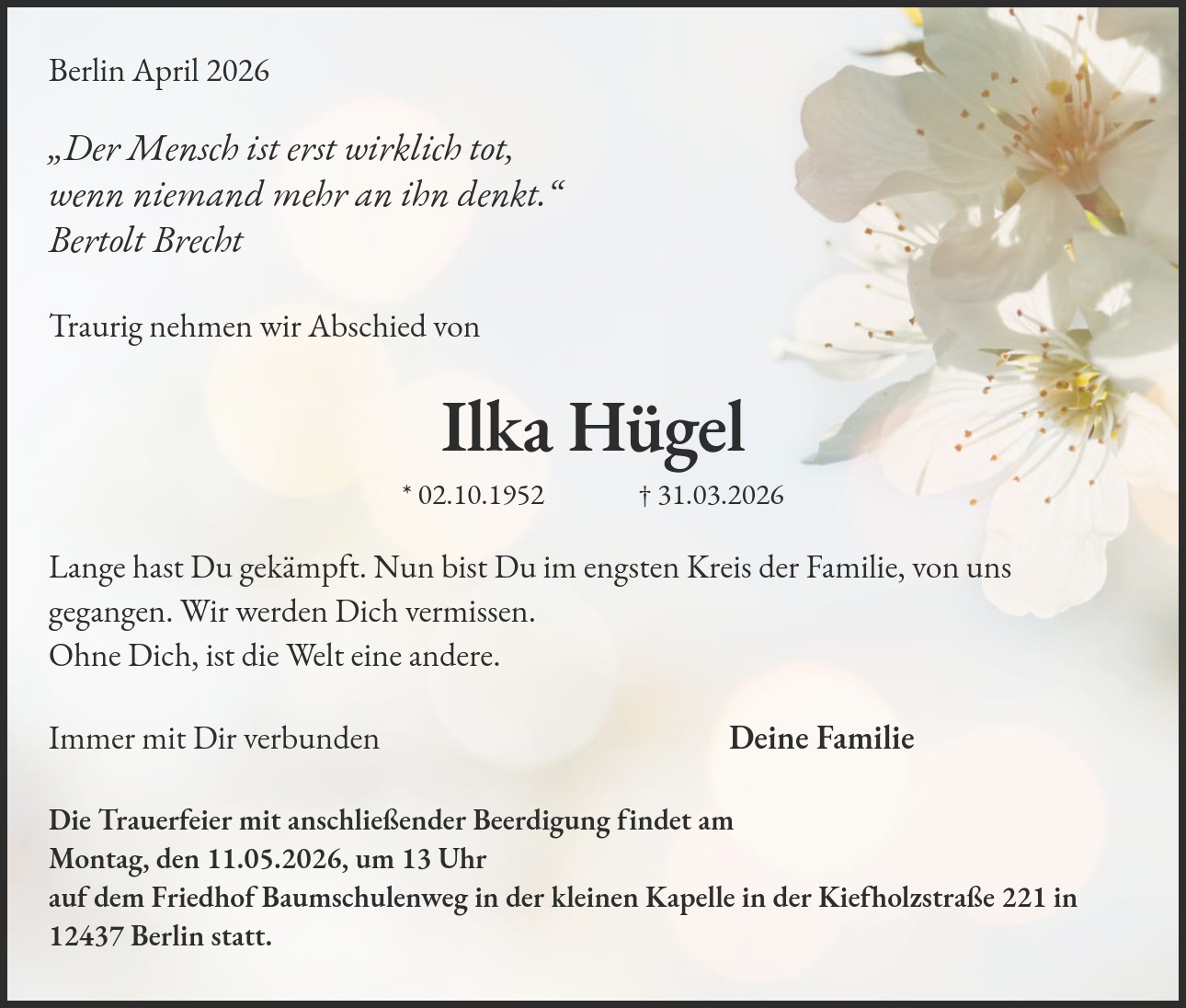 Die Trauerfeier mit anschließender Beerdigung findet am Montag, den 11.05.2026, um 13 Uhr auf dem Friedhof Baumschulenweg in der kleinen Kapelle in der Kiefholzstraße 221 in 12437 Berlin statt.