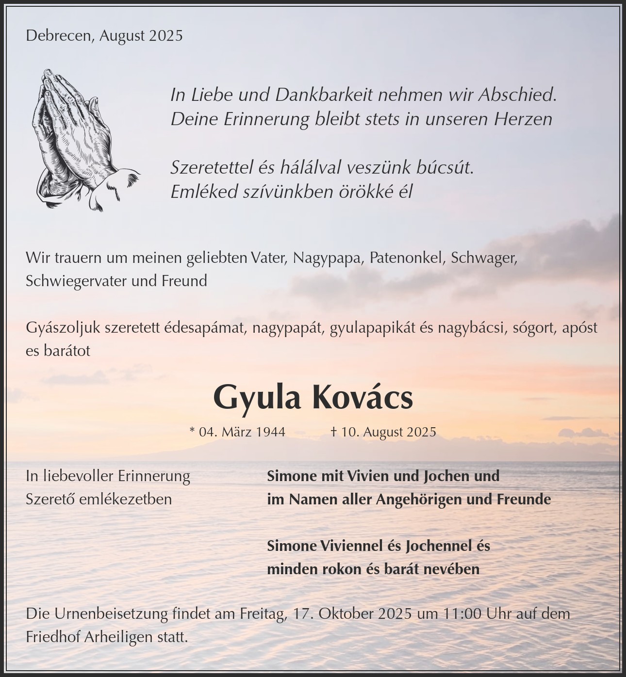 Wir trauern um meinen geliebten Vater, Nagypapa, Patenonkel, Schwager, Schwiegervater und Freund Gyászoljuk szeretett édesapámat, nagypapát, gyulapapikát és nagybácsi, sógort, apóst es barátot