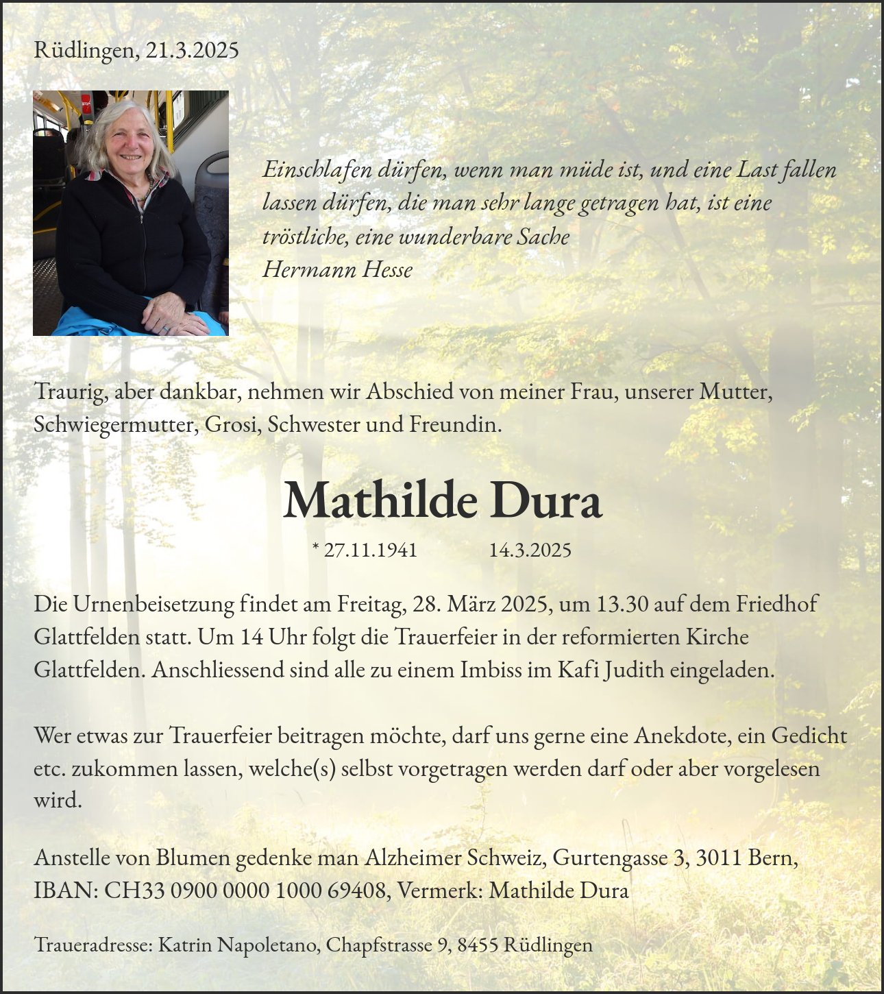 Anstelle von Blumen gedenke man Alzheimer Schweiz, Gurtengasse 3, 3011 Bern, IBAN: CH33 0900 0000 1000 69408, Vermerk: Mathilde Dura