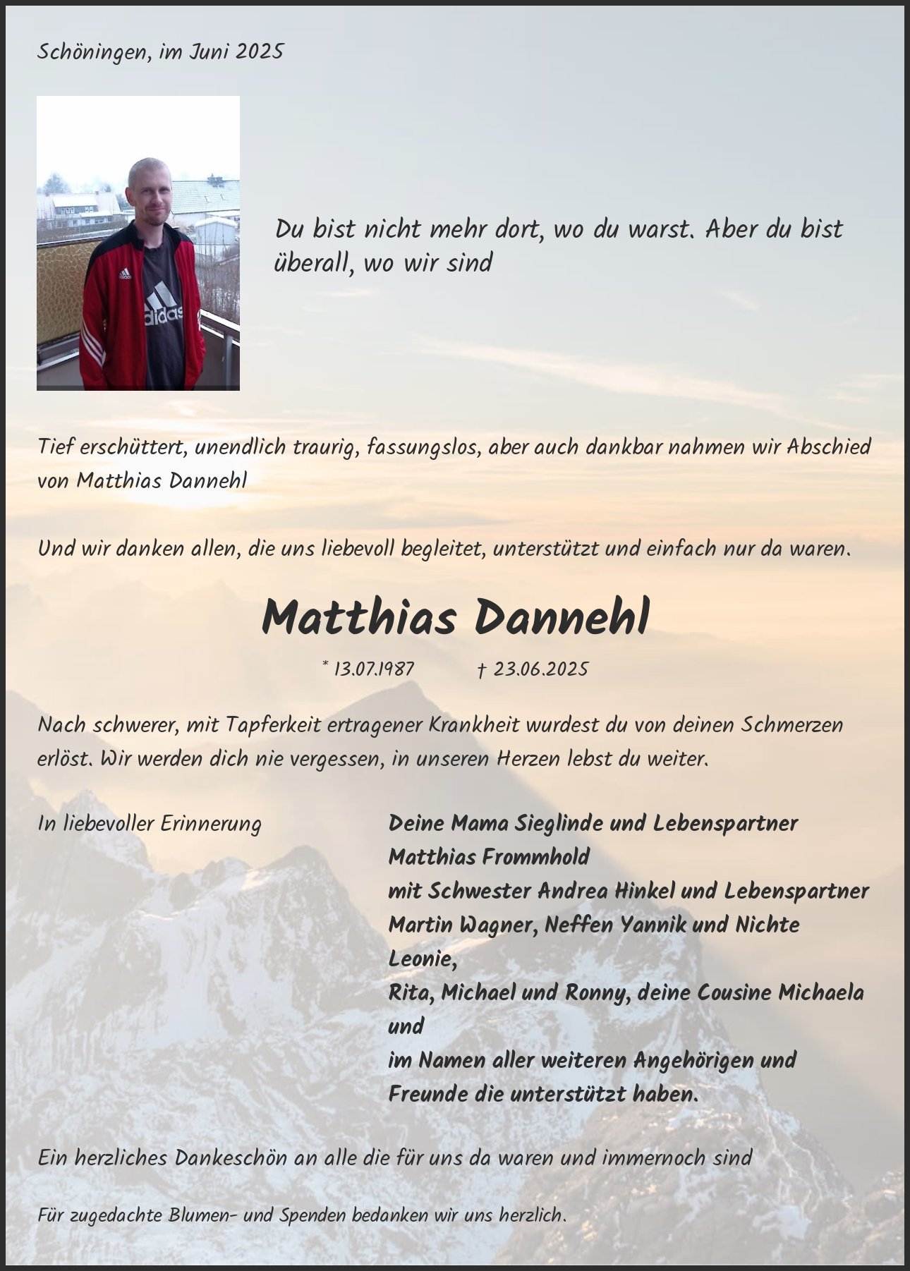 Tief erschüttert, unendlich traurig, fassungslos, aber auch dankbar nahmen wir Abschied von Matthias Dannehl Und wir danken allen, die uns liebevoll begleitet, unterstützt und einfach nur da waren.