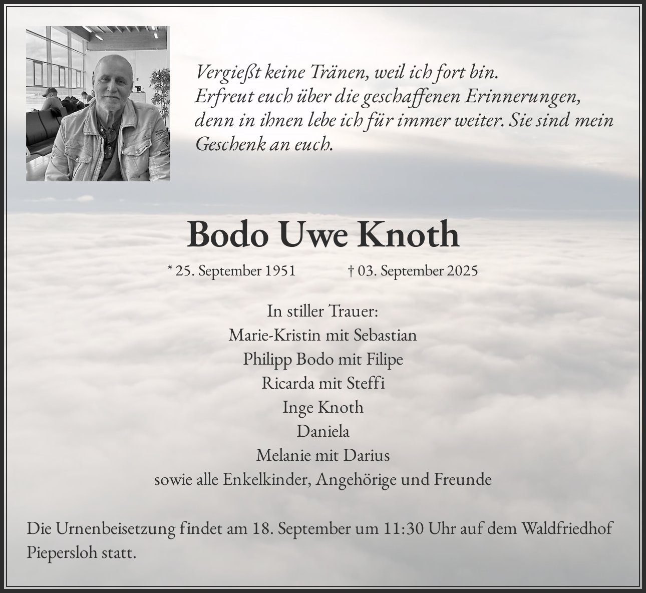 Die Urnenbeisetzung findet am 18. September um 11:30 Uhr auf dem Waldfriedhof Piepersloh statt.