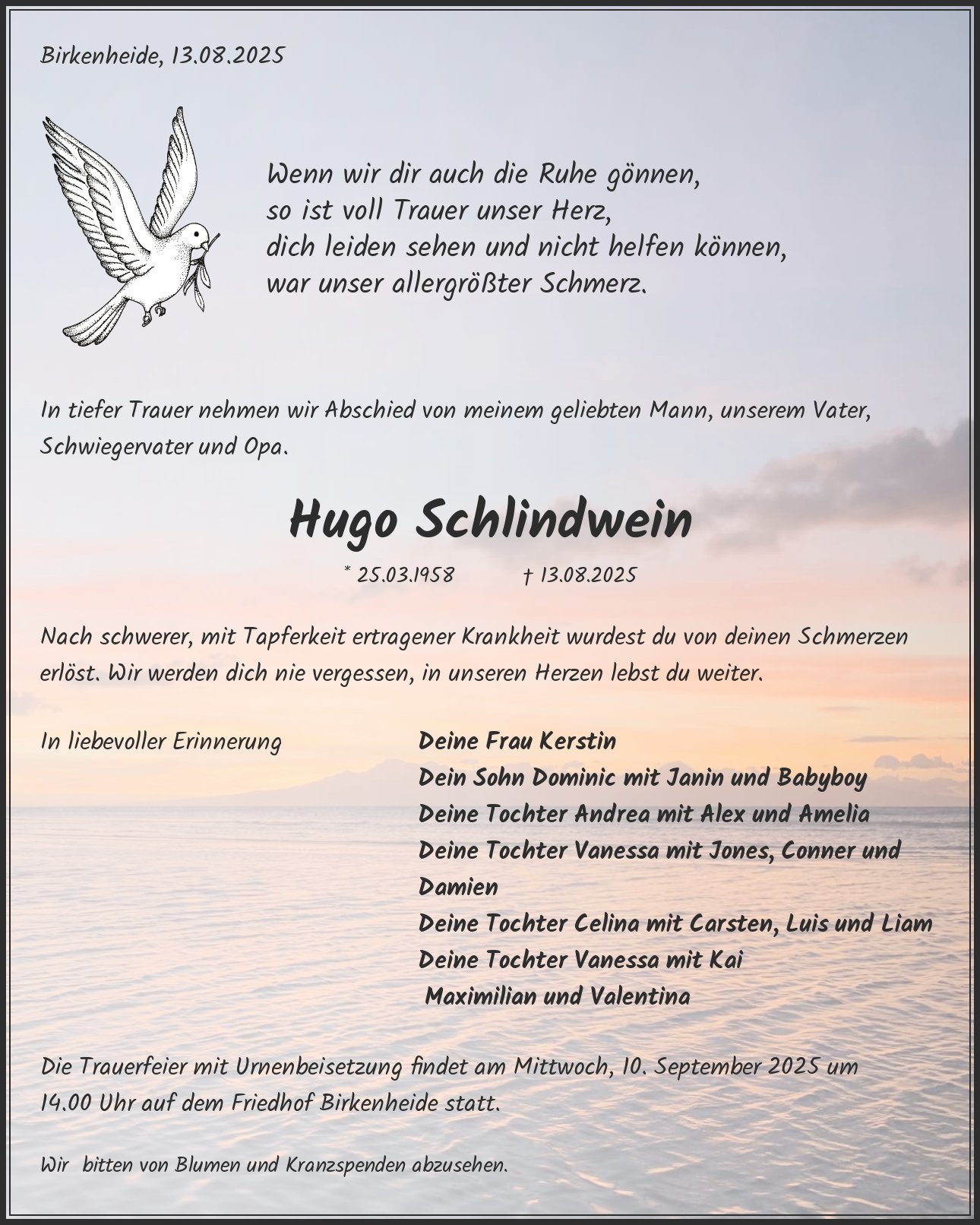 Die Trauerfeier mit Urnenbeisetzung findet am Mittwoch, 10. September 2025 um 14.00 Uhr auf dem Friedhof Birkenheide statt.