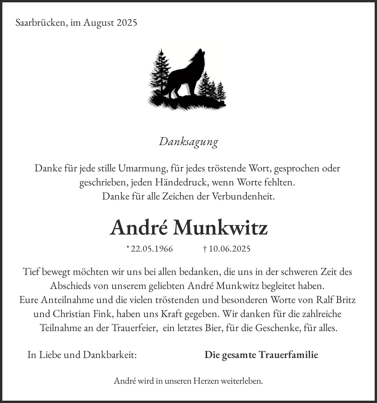 Tief bewegt möchten wir uns bei allen bedanken, die uns in der schweren Zeit des Abschieds von unserem geliebten André Munkwitz begleitet haben. Eure Anteilnahme und die vielen tröstenden und besonderen Worte von Ralf Britz und Christian Fink, haben uns Kraft gegeben. Wir danken für die zahlreiche Teilnahme an der Trauerfeier, ein letztes Bier, für die Geschenke, für alles.