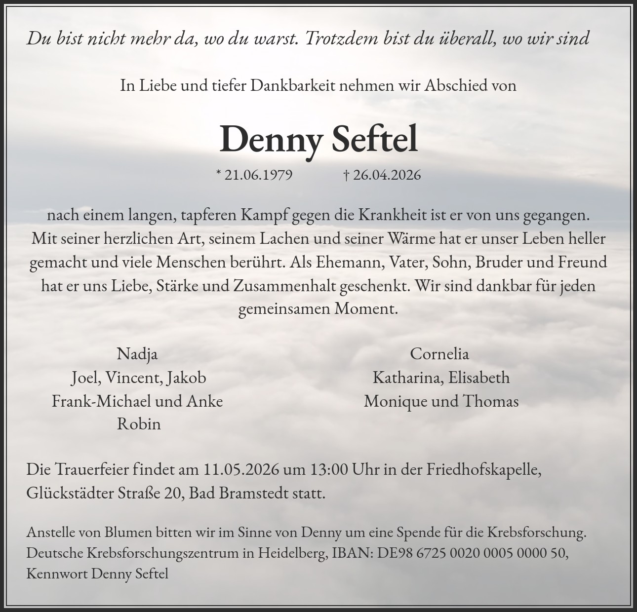 Anstelle von Blumen bitten wir im Sinne von Denny um eine Spende für die Krebsforschung. Deutsche Krebsforschungszentrum in Heidelberg, IBAN: DE98 6725 0020 0005 0000 50, Kennwort Denny Seftel