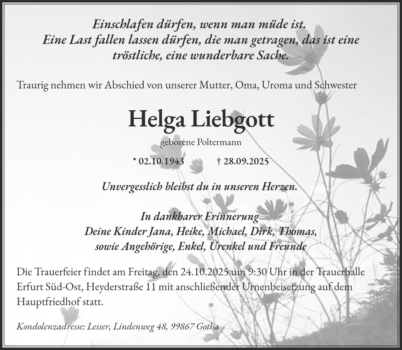 Die Trauerfeier findet am Freitag, den 24.10.2025 um 9:30 Uhr in der Trauerhalle Erfurt Süd-Ost, Heyderstraße 11 mit anschließender Urnenbeisetzung auf dem Hauptfriedhof statt.