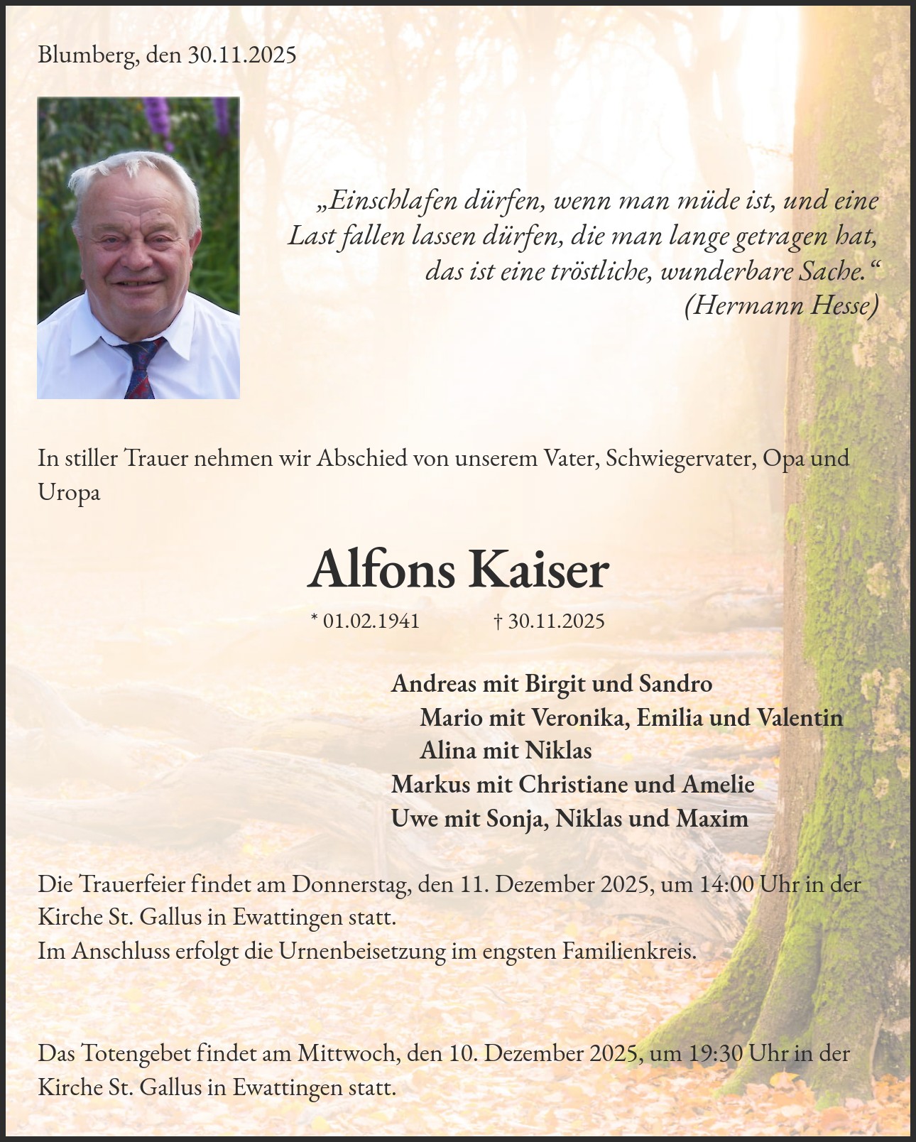 Die Trauerfeier findet am Donnerstag, den 11. Dezember 2025, um 14:00 Uhr in der Kirche St. Gallus in Ewattingen statt. Im Anschluss erfolgt die Urnenbeisetzung im engsten Familienkreis. Das Totengebet findet am Mittwoch, den 10. Dezember 2025, um 19:30 Uhr in der Kirche St. Gallus in Ewattingen statt.