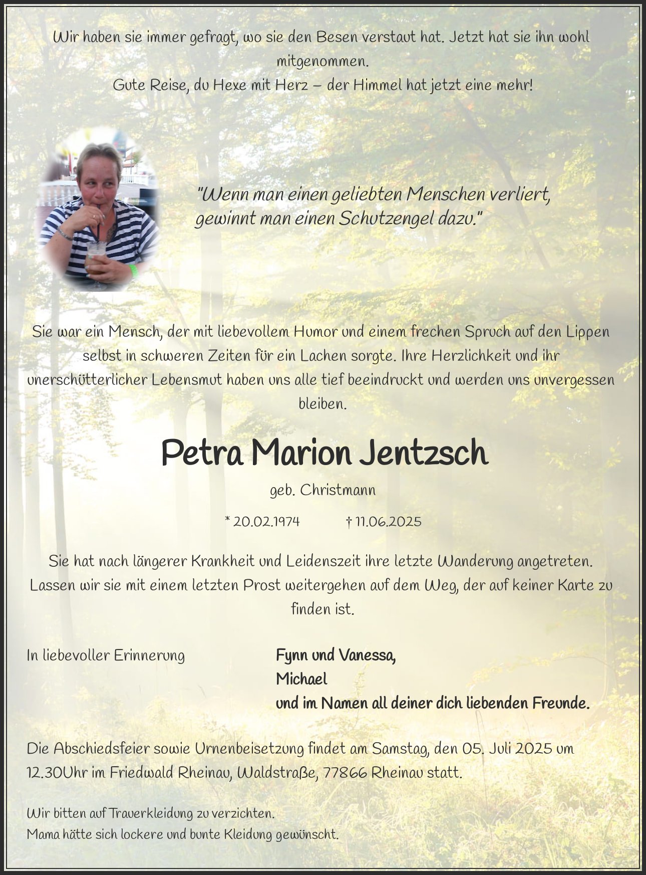 Die Abschiedsfeier sowie Urnenbeisetzung findet am Samstag, den 05. Juli 2025 um 12.30Uhr im Friedwald Rheinau, Waldstraße, 77866 Rheinau statt.