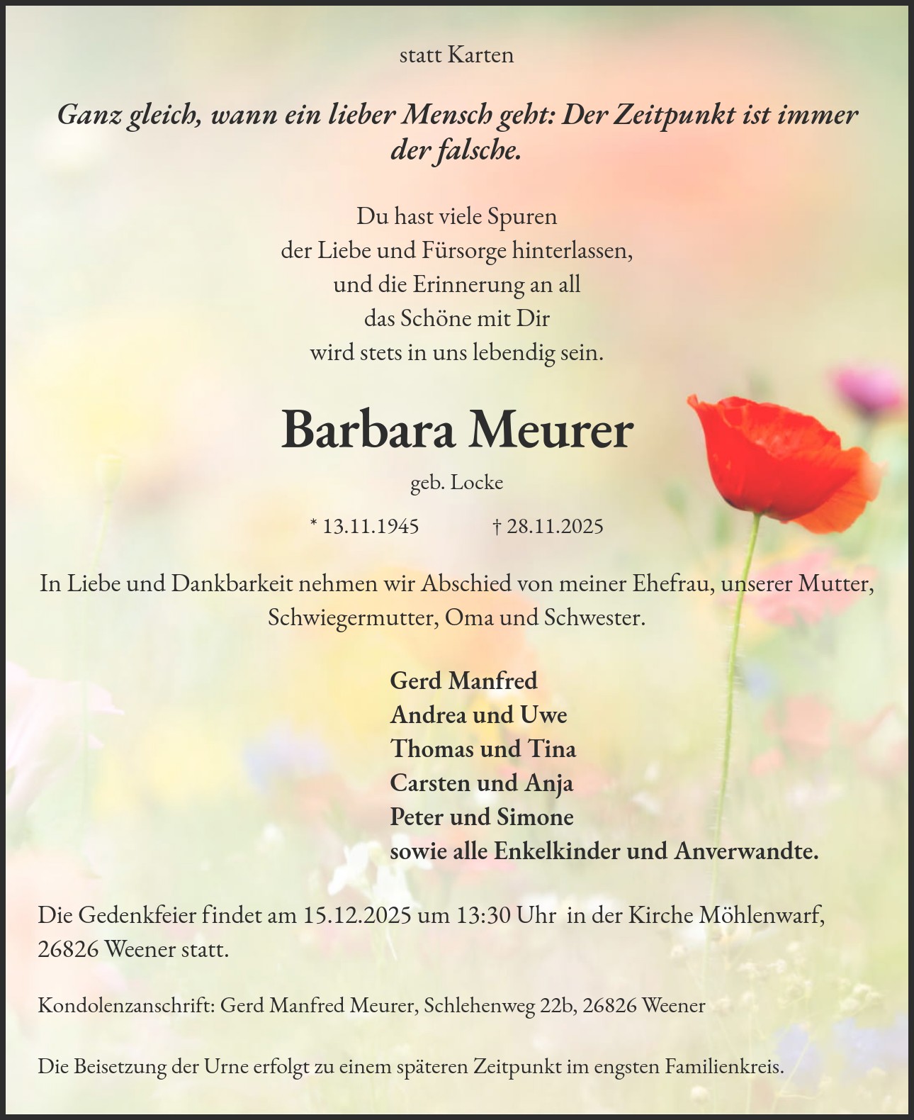 Kondolenzanschrift: Gerd Manfred Meurer, Schlehenweg 22b, 26826 Weener Die Beisetzung der Urne erfolgt zu einem späteren Zeitpunkt im engsten Familienkreis.