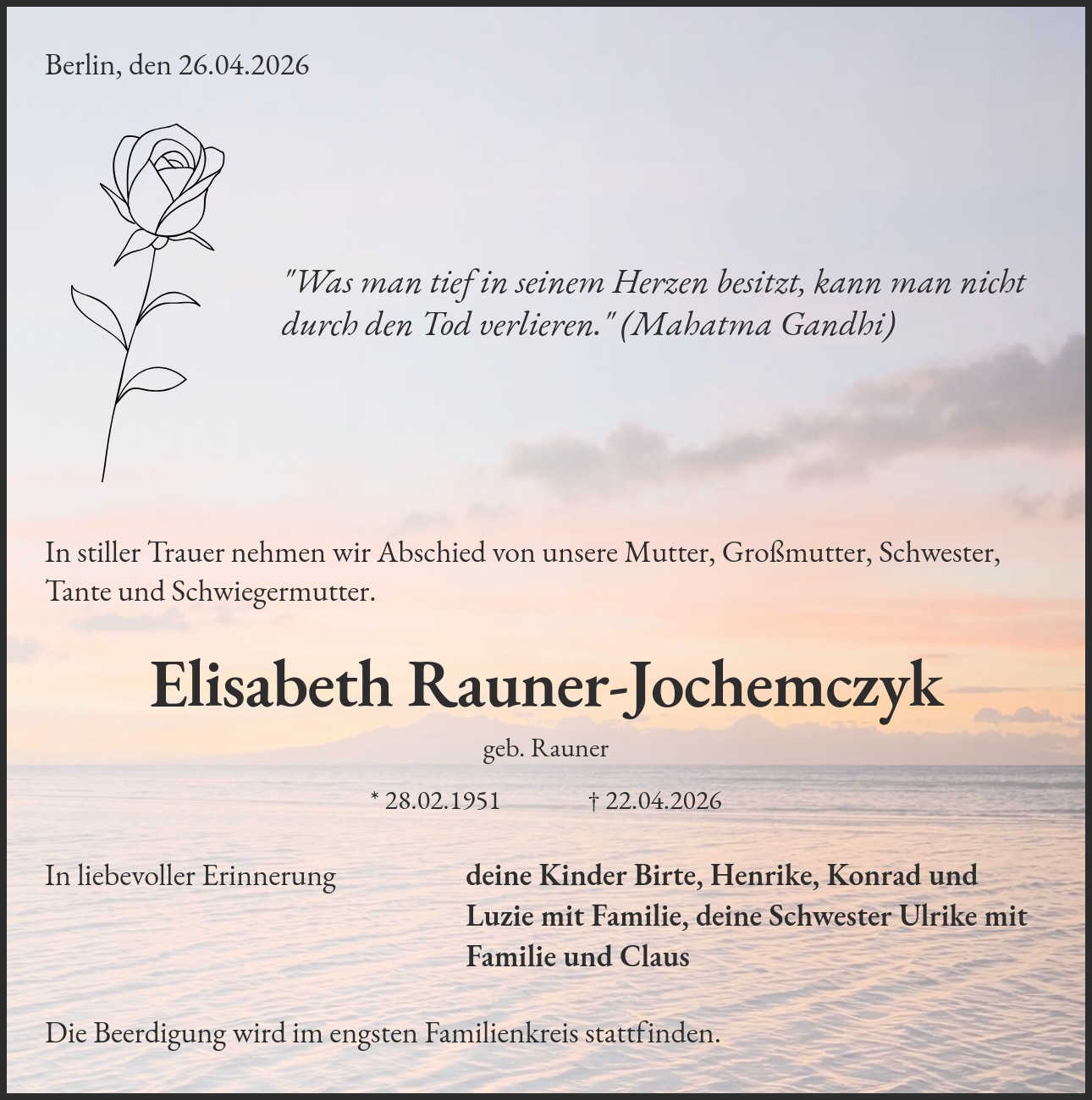 Die Beerdigung wird im engsten Familienkreis stattfinden.
