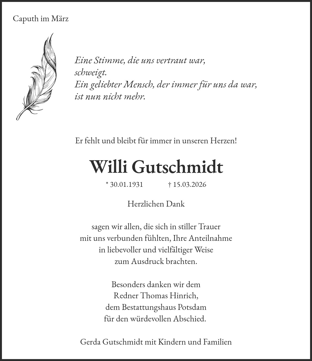 Herzlichen Dank sagen wir allen, die sich in stiller Trauer mit uns verbunden fühlten, Ihre Anteilnahme in liebevoller und vielfältiger Weise zum Ausdruck brachten. Besonders danken wir dem Redner Thomas Hinrich, dem Bestattungshaus Potsdam für den würdevollen Abschied. Gerda Gutschmidt mit Kindern und Familien