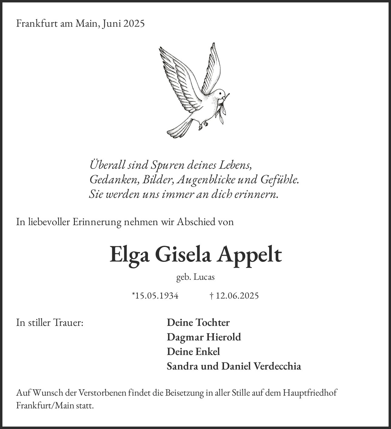 Auf Wunsch der Verstorbenen findet die Beisetzung in aller Stille auf dem Hauptfriedhof Frankfurt/Main statt.