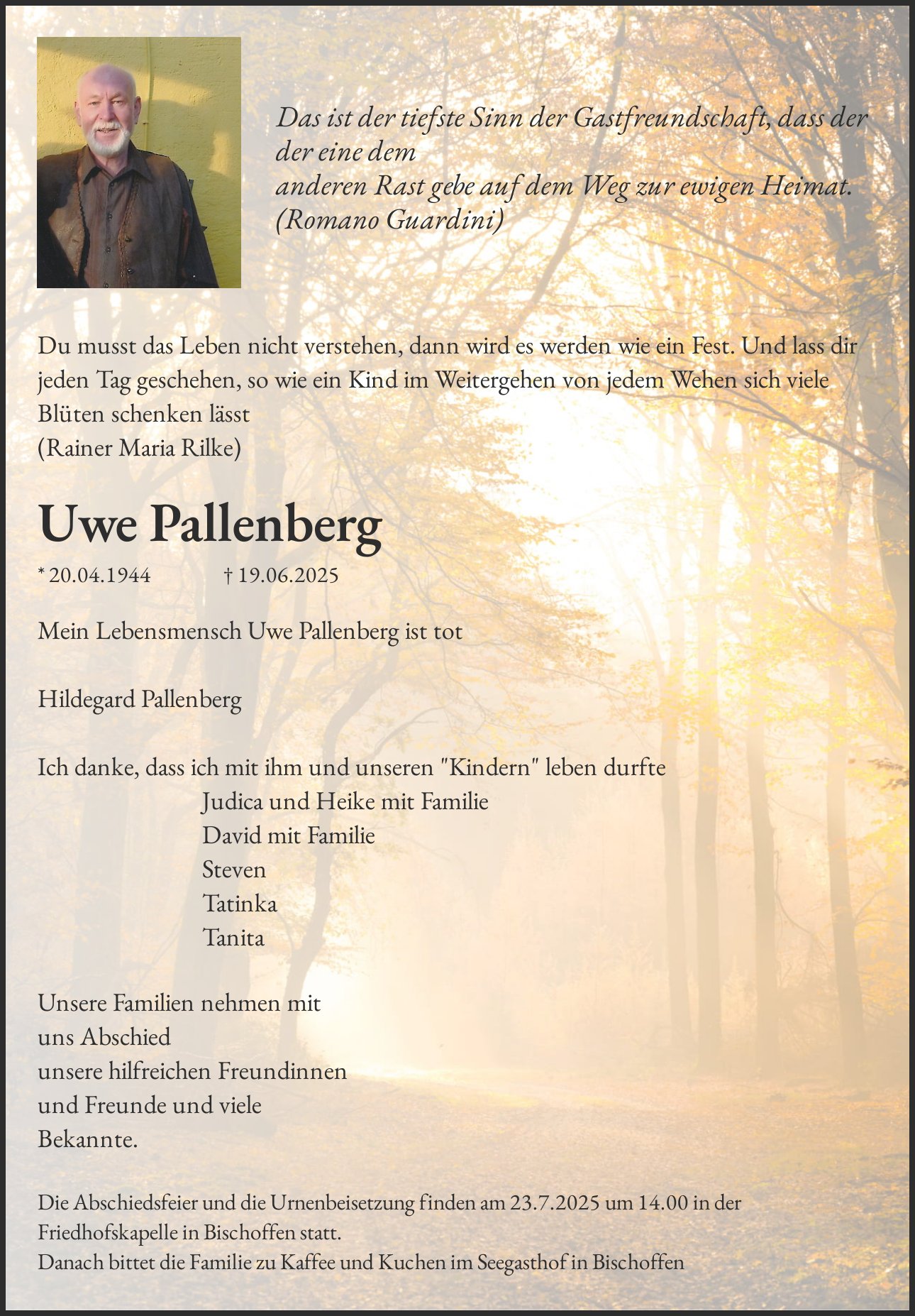 Mein Lebensmensch Uwe Pallenberg ist tot Hildegard Pallenberg Ich danke, dass ich mit ihm und unseren "Kindern" leben durfte Judica und Heike mit Familie David mit Familie Steven Tatinka Tanita