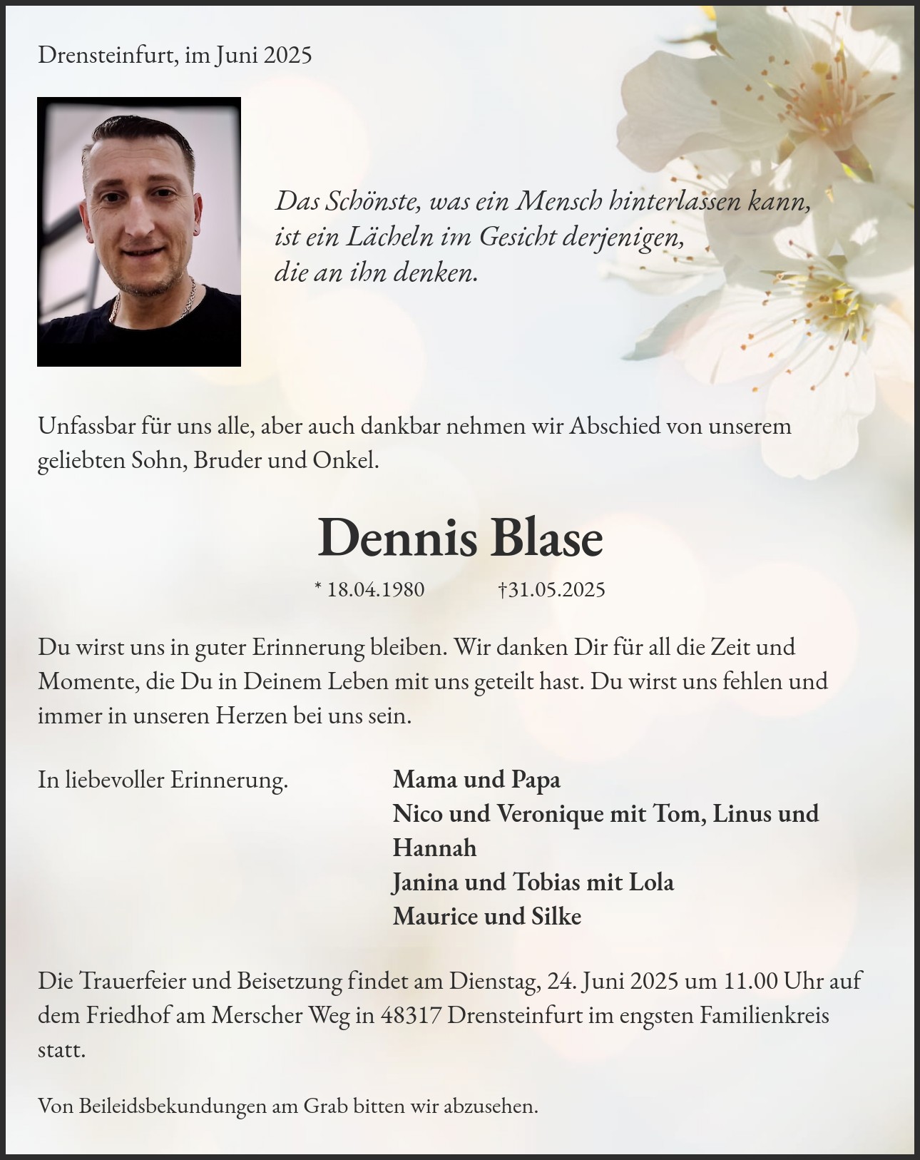Die Trauerfeier und Beisetzung findet am Dienstag, 24. Juni 2025 um 11.00 Uhr auf dem Friedhof am Merscher Weg in 48317 Drensteinfurt im engsten Familienkreis statt.